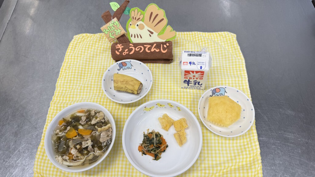 ◎給食 主食:磯うどん 主菜:きすの天ぷら 副菜:野菜のナムル 果物:バナナ
