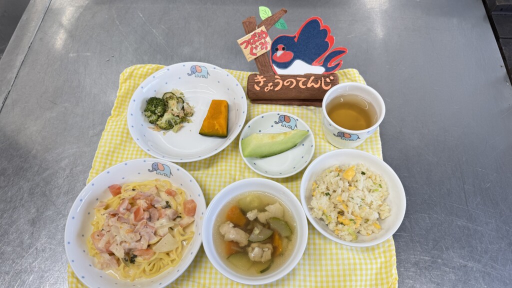 ◎給食 主食:トマトクリームパスタ 汁物:ズッキーニのチキンスープ 副菜:ツナとブロッコリーのサラダ 副菜:蒸し南瓜 果物:メロン