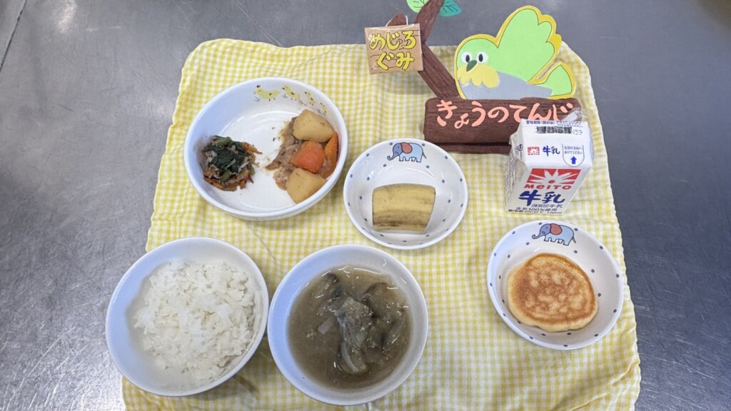 ◎給食 主食:ご飯 汁物:味噌汁(なす・たまねぎ) 主菜:肉じゃが 副菜:和え物 果物:バナナ(果物変更となります)
