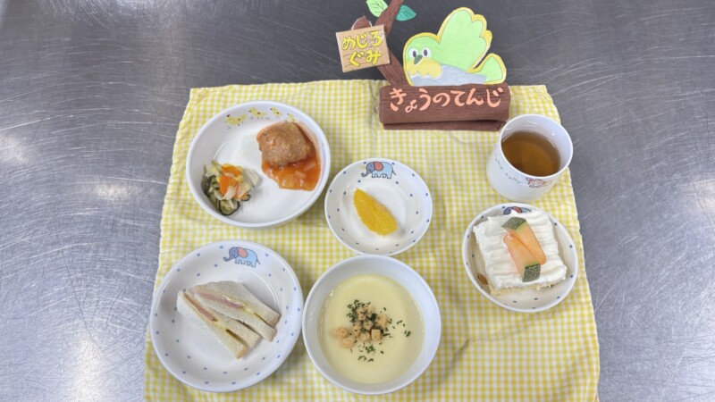 ◎給食 主食:サンドイッチ 汁物:ビシソワーズ 主菜:ミートボール 副菜:フレンチサラダ 果物:オレンジ(果物変更になります)