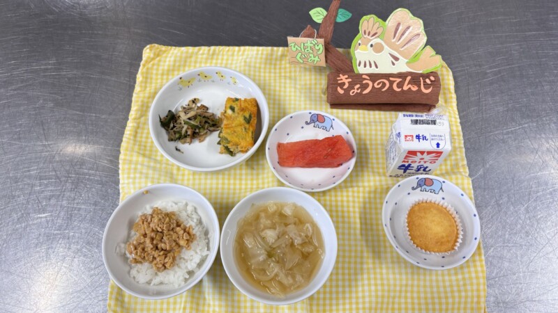 ◎給食 主食:納豆ご飯 汁物:味噌汁(きゃべつ・玉葱) 主菜:千草焼き 副菜:もやしの胡麻和え 果物:すいか