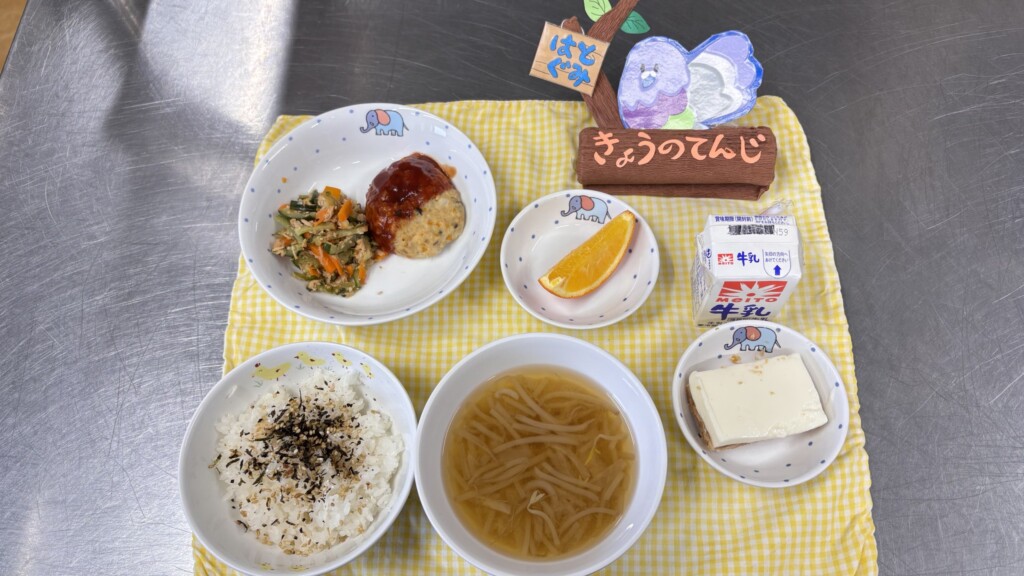 ◎給食 主食:ふりかけご飯 汁物:味噌汁(大根・もやし) 主菜:豆腐ハンバーグ 副菜:ゴーヤサラダ 果物:オレンジ(果物変更になります)