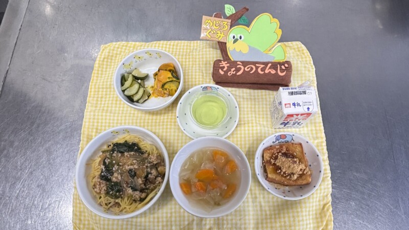 🍉和風スパゲティはきのこや野菜、ひき肉いりの和風味。麺類が人気なのでよく食べてくれました。おやつも黒蜜ときなこがついていつもと違う風味です。