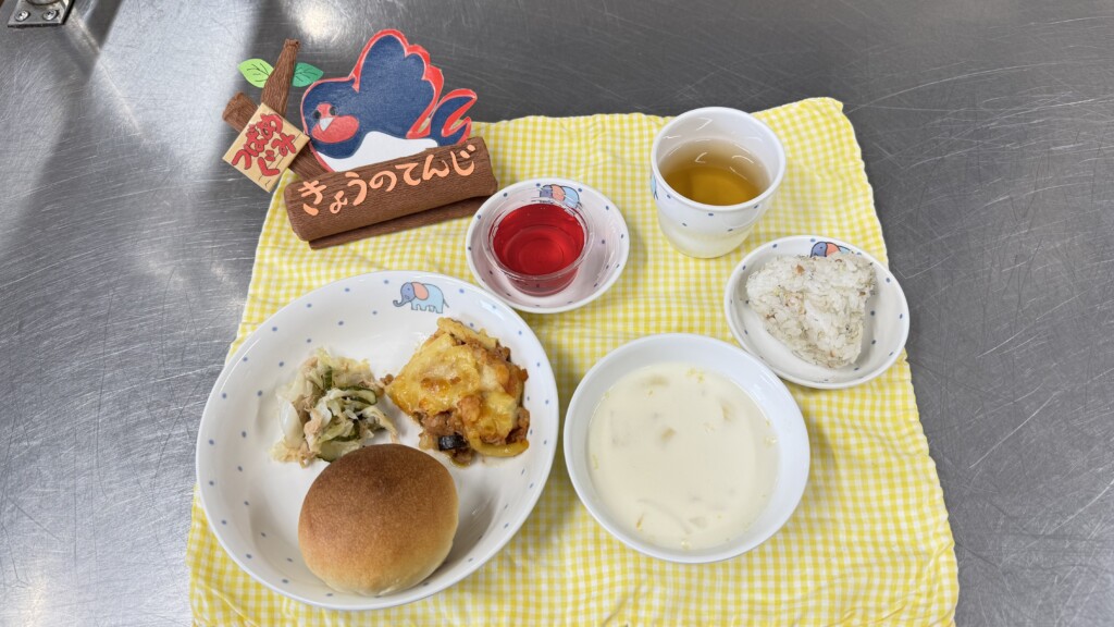 ◎給食 主 食:牛乳パン 汁 物:コーンポタージュ 主 菜:なすのミートグラタン 副 菜:キャベツサラダ デザート:ゼリー(ぶどう味)