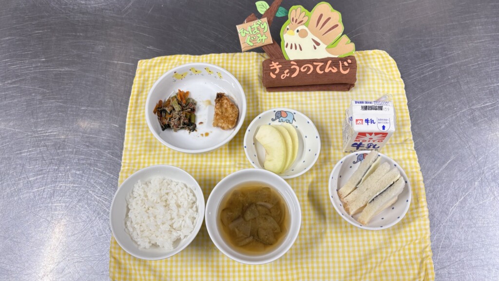 ◎給食 主食:ご飯 汁物:味噌汁(なす・玉ねぎ) 主菜:カジキマグロのから揚げ 副菜:五目和え 果物:りんご