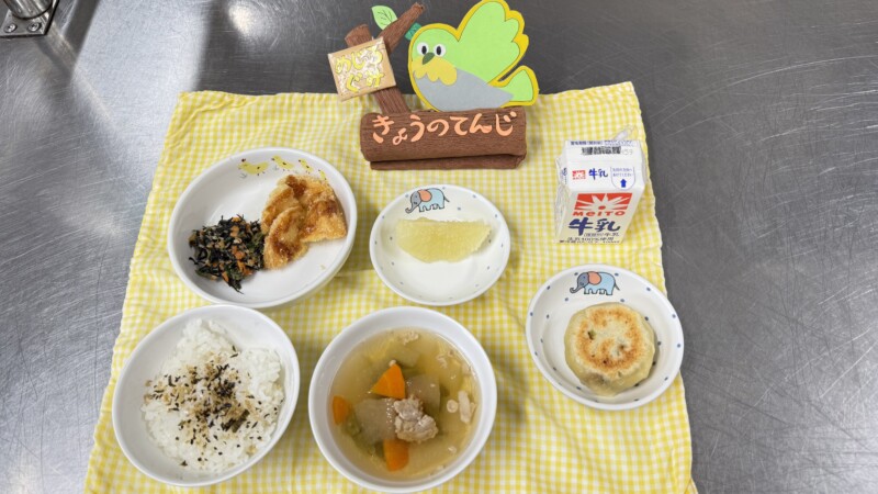◎給食 主食:ふりかけごはん 汁物:とうがんスープ 主菜:チーズはんぺんフライ 副菜:ほうれん草ひじきサラダ 果物:グレープフルーツ