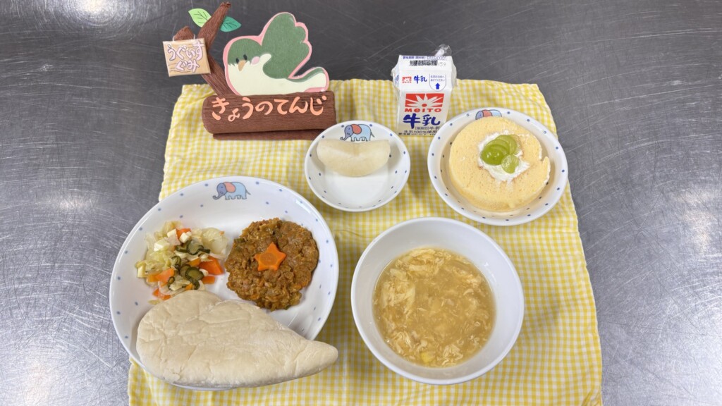 🍇キーマはヒンドゥ語でひき肉を表す言葉。久しぶりのキーマカレーはナンに挟まない子もいましたがみんなよく食べていました。今月のケーキは旬のシャインマスカットを使ったロールケーキです🎂