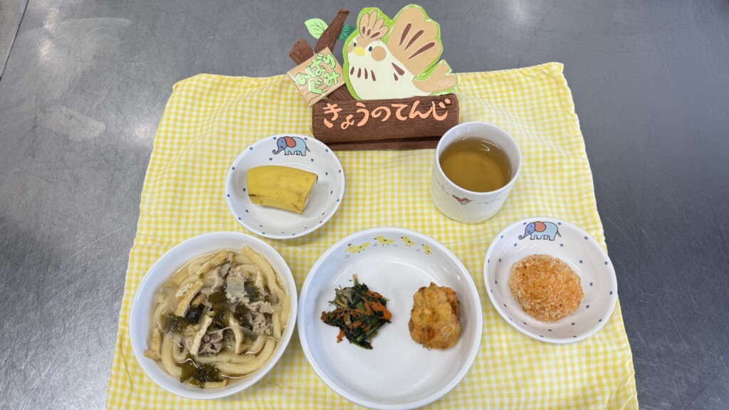 ◎給食 主食:磯うどん 主菜:豆腐のまさご揚げ 副菜:ほうれん草の和え物 果物:バナナ