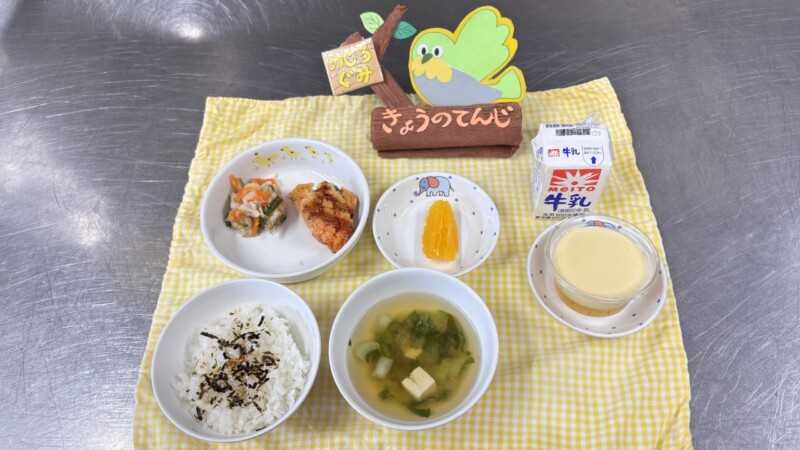 ◎給食 主食:ふりかけご飯 汁物:味噌汁(青梗菜・豆腐) 主菜:鮭フライ 副菜:梅ドレッシングサラダ 果物:オレンジ