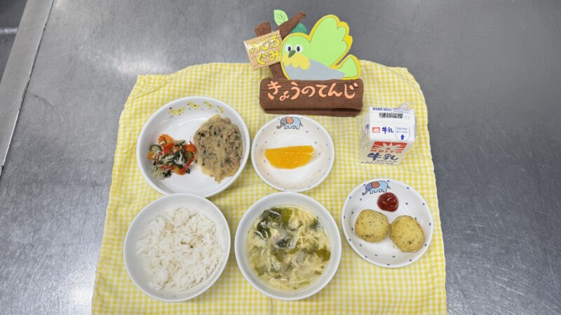 ◎給食 主食:もち麦ご飯 汁物:かきたま中華風スープ 主菜:麻婆春雨 副菜:しらす入り中華サラダ 果物:オレンジ