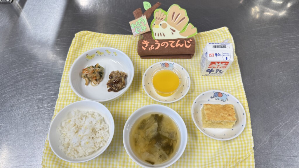 ◎給食 主食:五穀米ご飯 汁物:味噌汁(キャベツ・わかめ)※具が変更になっています 主菜:鯵のかば焼き※サバの味噌煮から変更になっています 副菜:五目和え デザート:ゼリー(オレンジ味)