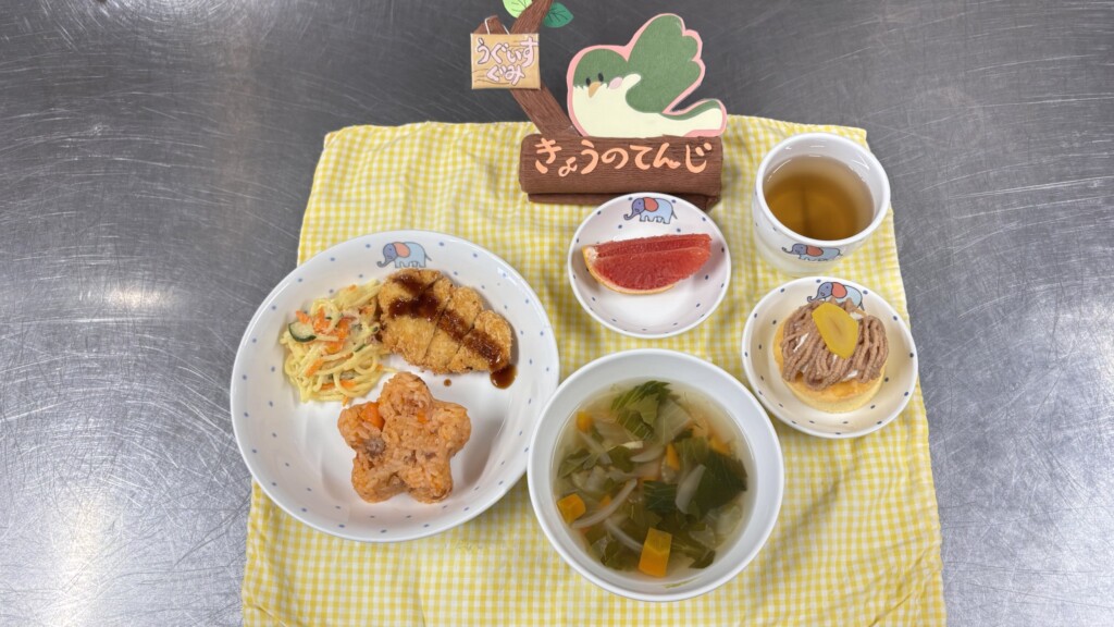◎給食 主食:ポークライス 汁物:野菜スープ 主菜:チキンカツ 副菜:スパゲティーサラダ 果物:グレープフルーツ