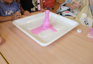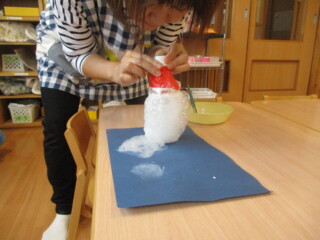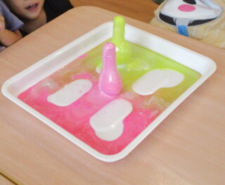 「魔女みたい」と大喜びで泡を作っていました。「私の泡はピンク」「緑」と出来上がった泡に大喜びでした。