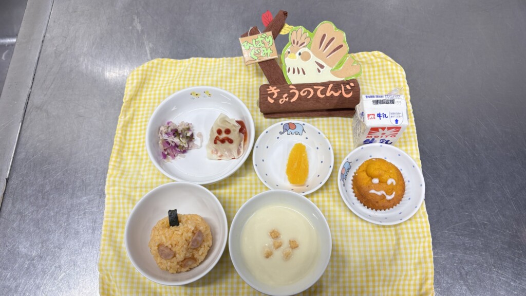 🎃ハロウィンライスはすりおろした人参の色とウインナーの目でジャック・オー・ランタンを表現しました。ミートボールは焼き上げたあと、焼売の皮をのせ蒸しています。ハロウィン献立は子どもたちにも喜んでもらえました😄🎃