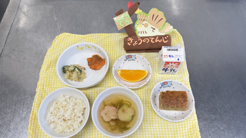 ◎給食 ・主食:きびごはん ・汁物:すまし汁(ねぎ・はなふ・えのき) ・主菜:鮭の味噌バター煮 ・副菜:野菜の和風マヨネーズ和え ・果物:オレンジ