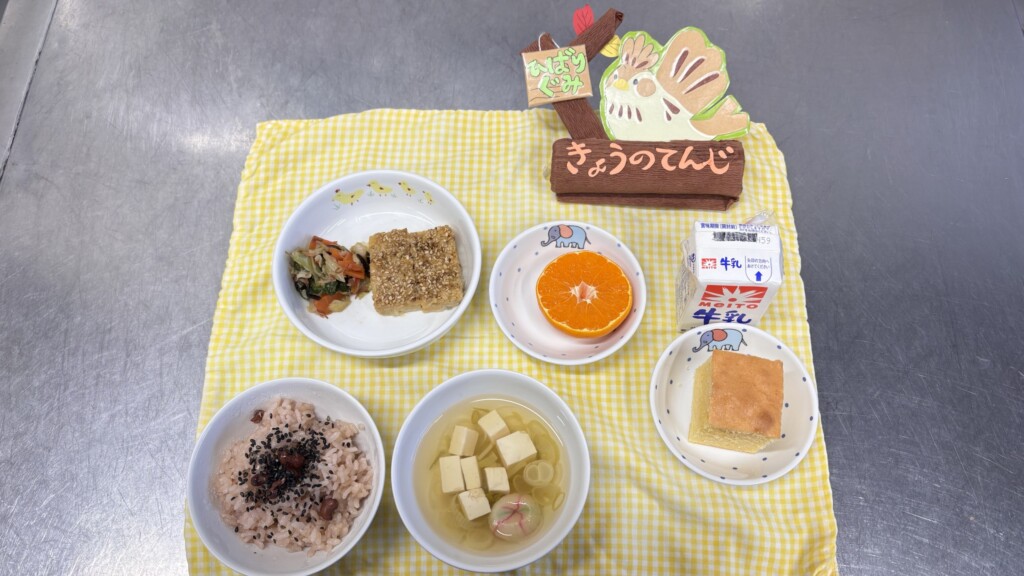 ◎給食 主食:赤飯 汁物:すまし汁(てまり麩・豆腐・葱) 主菜:松風焼き 副菜:野菜の塩昆布和え 果物:みかん
