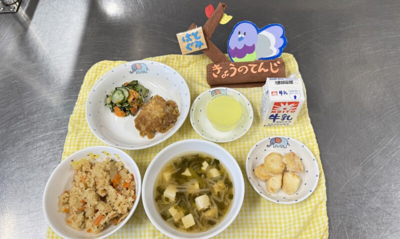 ◎給食 主 食:きんぎょめし 汁 物:味噌汁(豆腐・もやし・ねぎ) 主 菜:名古屋チキン 副 菜:小松菜の和マヨ和え デザート:ゼリー(グレープフルーツ)