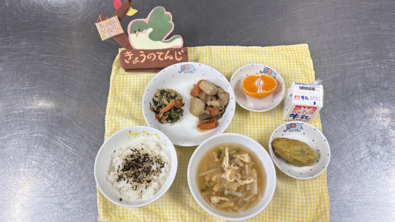 ◎給食 主食:ふりかけご飯 汁物:味噌汁(大根・油揚げ) 主菜:いり鶏 副菜:野菜とツナの和え物 果物:みかん