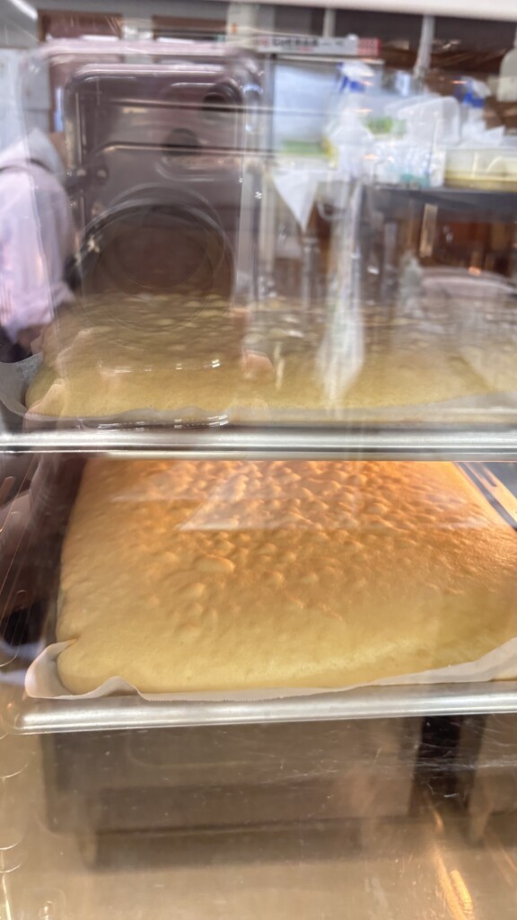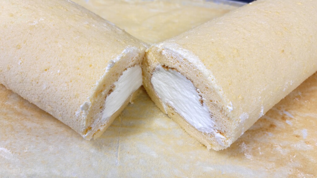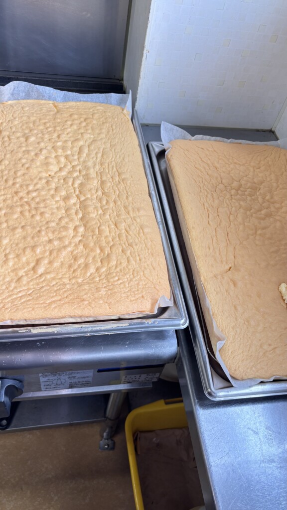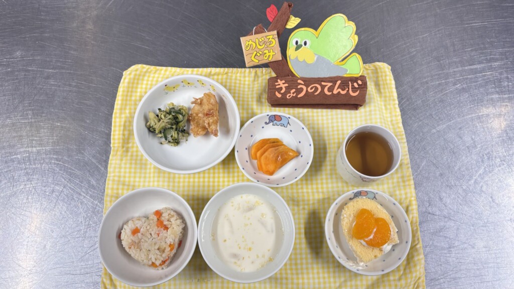 🥕今月の誕生日会献立はみかんのロールケーキです。手作りケーキはスポンジを焼いて作ります、季節の果物を使ったりして毎月ちがうかたちにしており、子どもたちにも好評です🎂