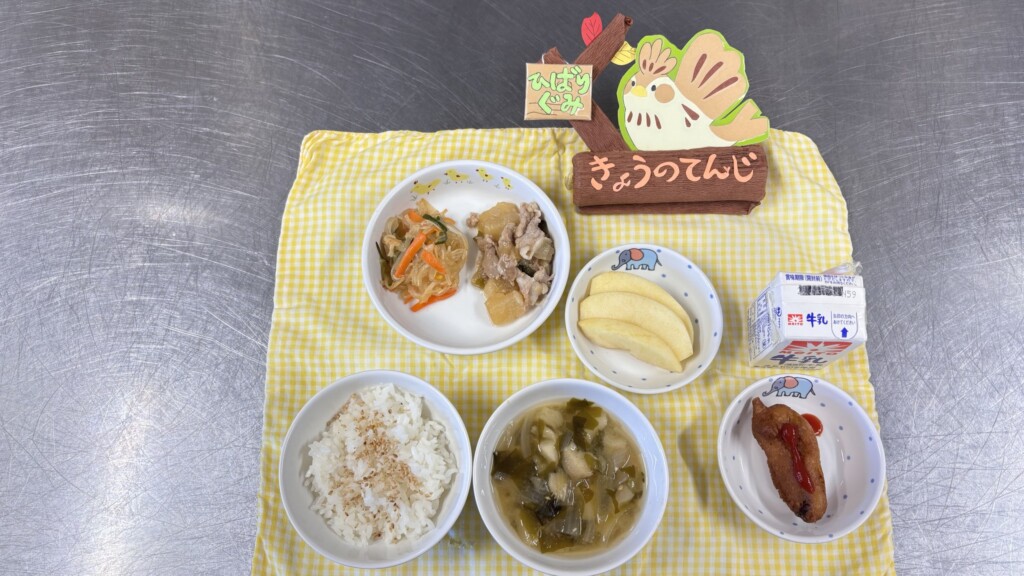 ◎給食 主食:胡麻ご飯 汁物:味噌汁(玉葱・若布・麩) 主菜:豚肉と大根の煮物 副菜:春雨サラダ 果物:りんご