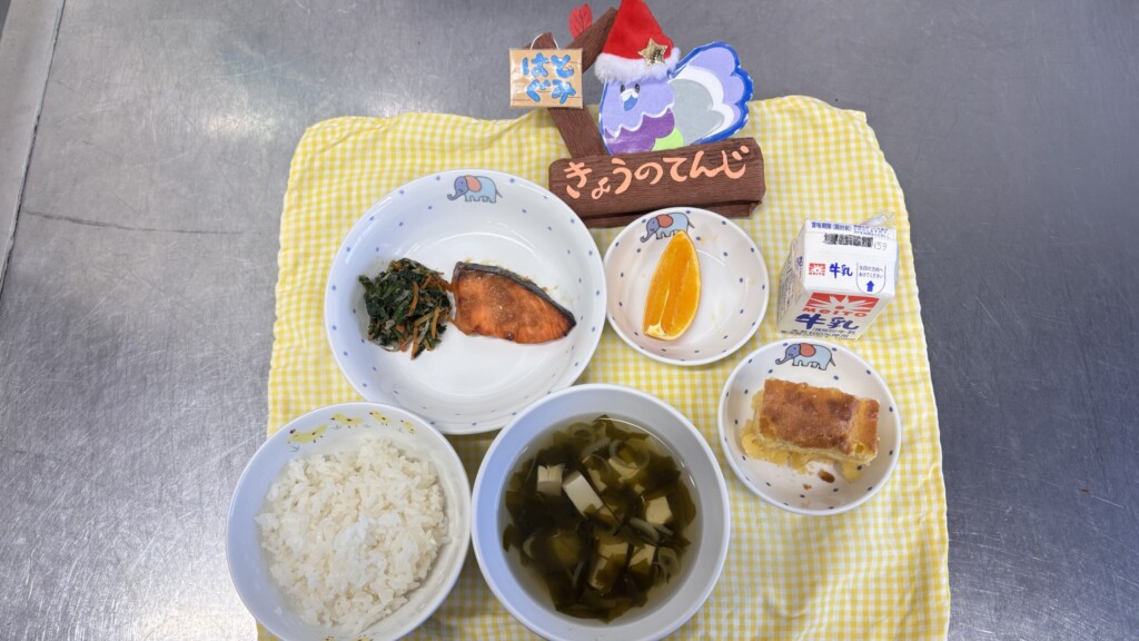 ◎給食 主食:ご飯 汁物:すまし汁(若布・豆腐・葱) 主菜:鮭の味噌バター煮 副菜:野菜の胡麻和え 果物:オレンジ