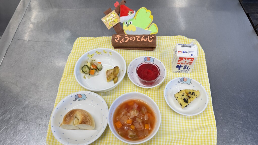 ◎給食 主 食:ベーグル 汁 物:ミネストローネ 主 菜:タンドリーチキン 副 菜:野菜とチーズのサラダ デザート:ゼリー(ぶどう味)