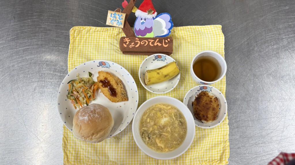 ◎給食 主食:白パン 汁物:ひき肉と卵のスープ 主菜:たらのフライ 副菜:キャベツサラダ 果物:バナナ