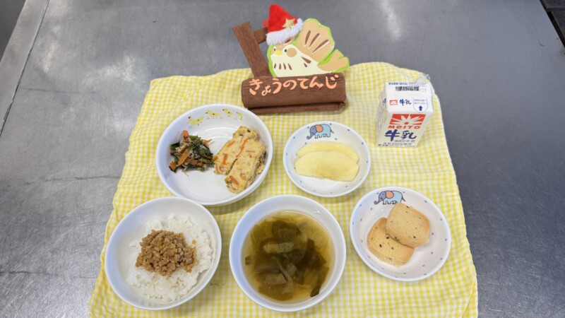 ◎給食 主食:納豆ご飯 汁物:味噌汁(白菜・玉葱・若布) 主菜:ぎせい豆腐 副菜:五目和え 果物:りんご
