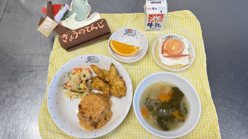 ◎給食 主食:ポークライス 汁物:青梗菜の野菜スープ 主菜:ささみのフリッター 副菜:ちょうちょサラダ 果物:オレンジ