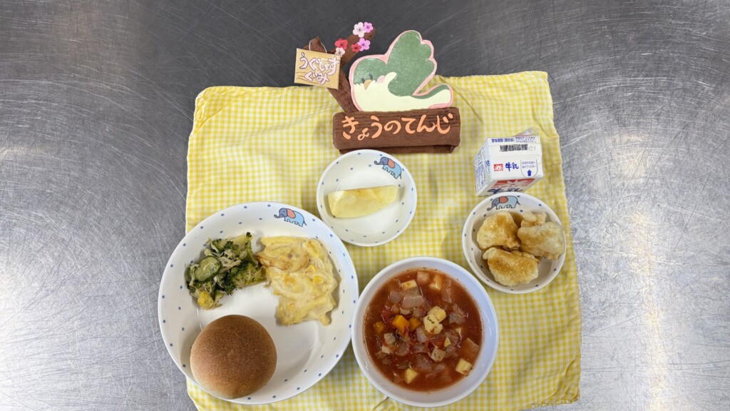 ◎給食 主食:ぎゅうにゅうぱん 汁物:ミネストローネスープ 主菜:マカロニグラタン 副菜:ブロッコリーとしらすのサラダ 果物:りんご