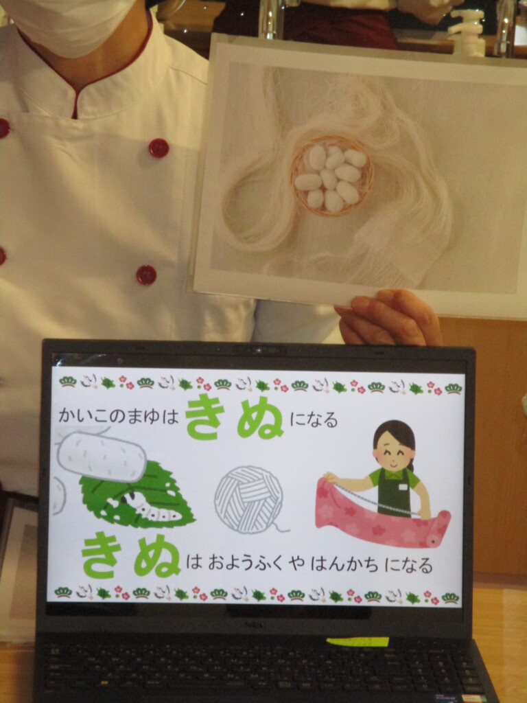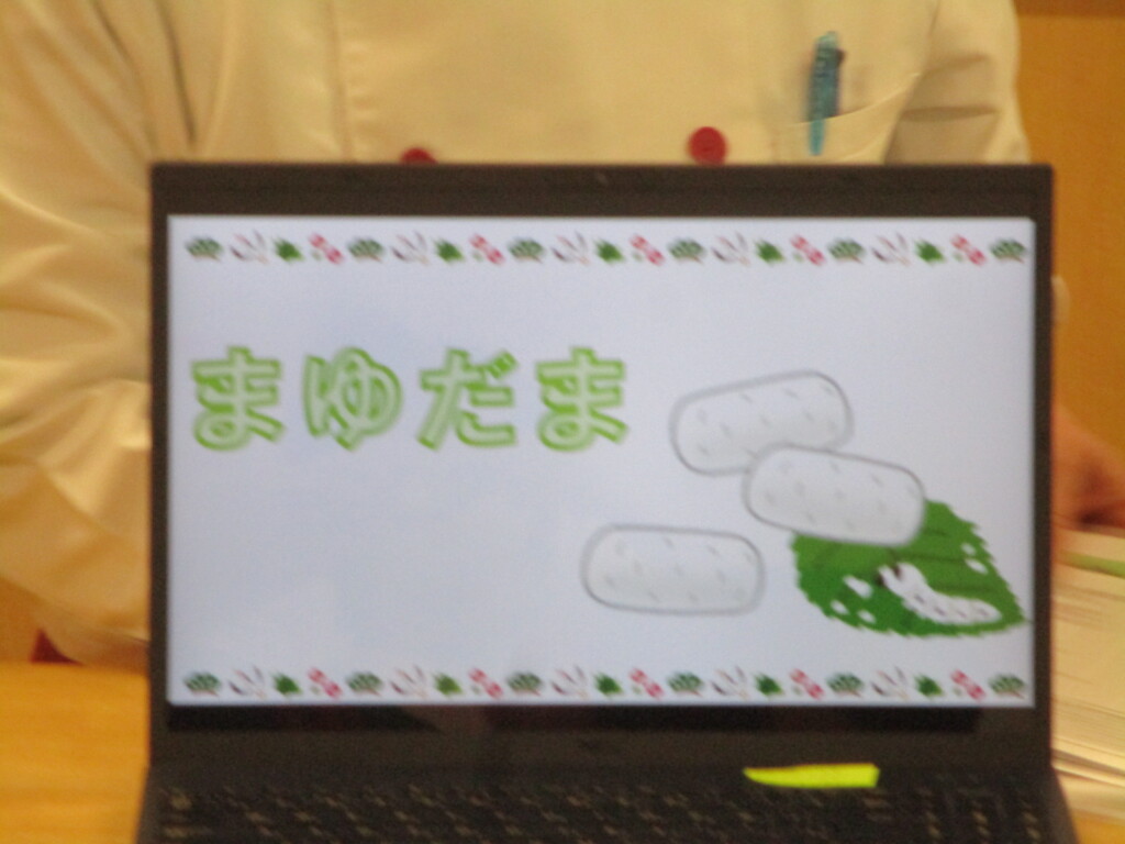 まゆ玉飾りは小正月に五穀豊穣や商売繫盛などの願いをこめた正月飾りの一つです。絹の材料となる繭玉をつくる蚕(かいこ)が無事に育つように願いを込めて、繭に似せたまゆ玉飾りを作るお話をしました。