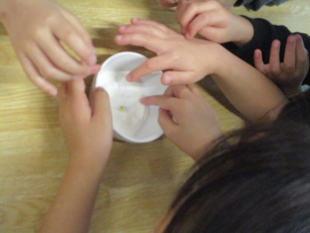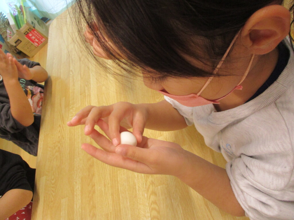 夏にお米を作ったはと組さん。まゆ玉飾りはお米の粉で作ります。同じ白い粉でも片栗粉や小麦粉とは違うことを触って体感してもらいました。