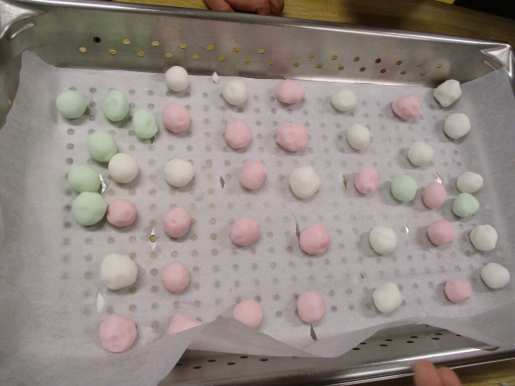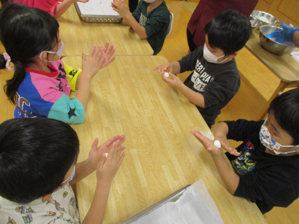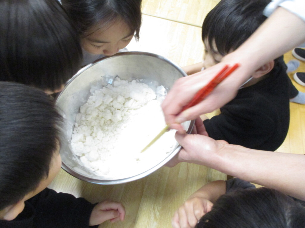 お米の粉は熱湯でこねていきます。今回は三色のお団子です。みんなうまく丸めることができるかな?