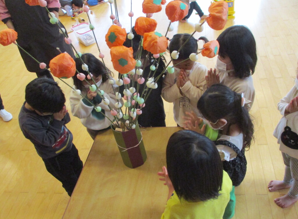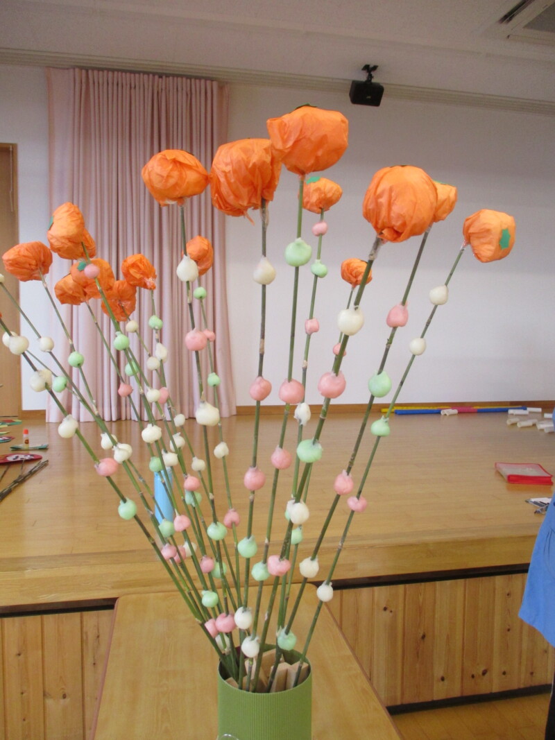 できあがっただんごを蒸して枝にさしました。先端にはうぐいす組さんが作ってくれたみかんを飾って完成です!
