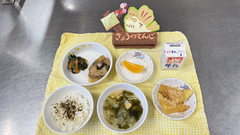 ◎給食 主食:ふりかけごはん 汁物:味噌汁(白菜・若布・油揚げ) 主菜:鶏と大根の煮物 副菜:ほうれん草の胡麻和え 果物:オレンジ