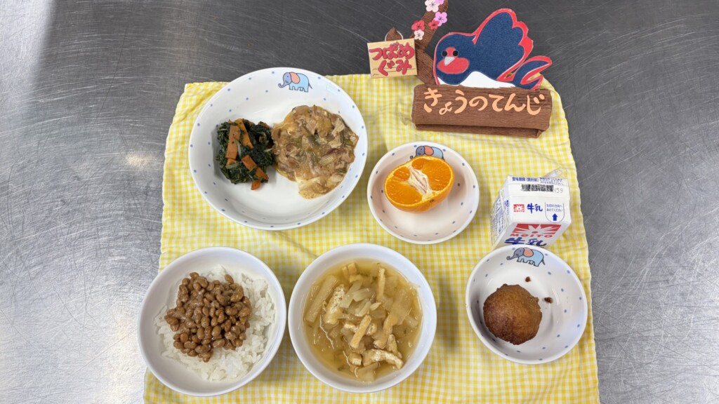 ◎給食 主食:納豆ご飯 汁物:味噌汁(大根・油揚げ) 主菜:肉豆腐 副菜:野菜の胡麻和え 果物:みかん