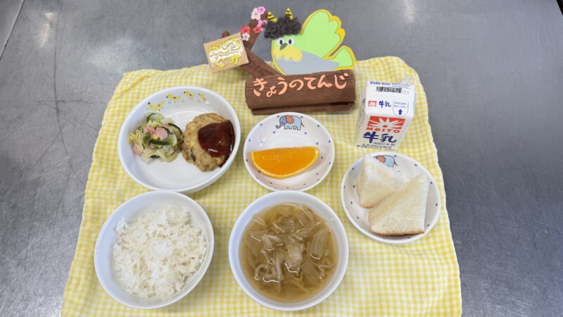 ◎給食 主食:ご飯 汁物:味噌汁(玉葱・もやし) 主菜:豆腐ハンバーグ 副菜:キャベツサラダ 果物:オレンジ