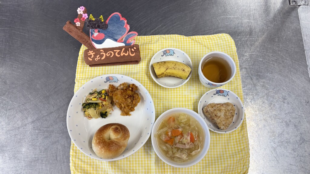◎給食 主食:ベーグル 汁物:野菜スープ 主菜:チキンコーンフレーク焼き 副菜:カニカマとブロッコリーのサラダ 果物:バナナ