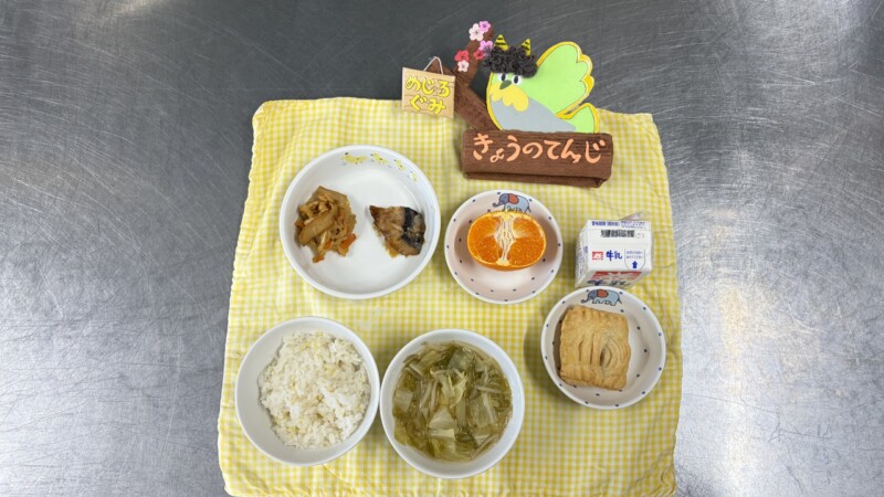 ◎給食 主食:五穀米ご飯 汁物:味噌汁(きゃべつ・もやし) 主菜:鰤のバター醤油焼き 副菜:切り干し大根の煮物 果物:みかん