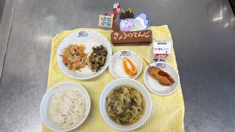 ◎給食 主食:もち麦ご飯 汁物:きのこのかきたま汁 主菜:プルコギ 副菜:春雨サラダ 果物:ポンカン
