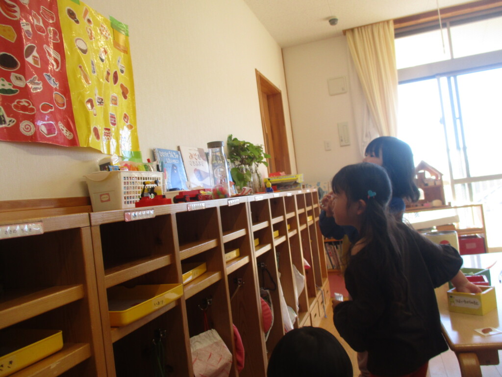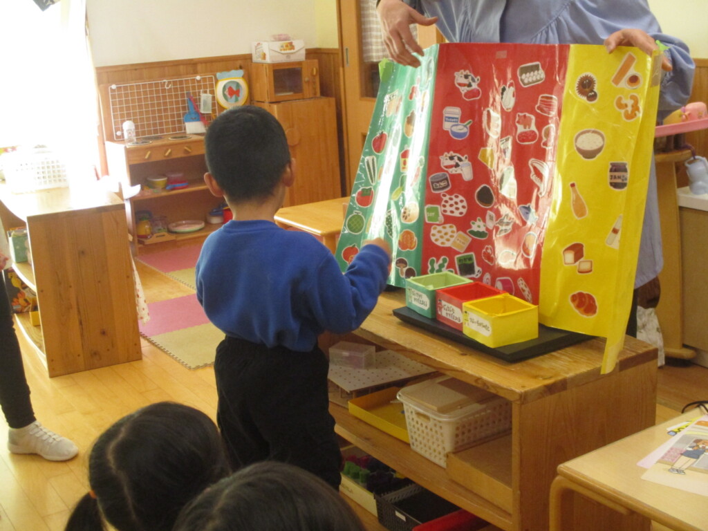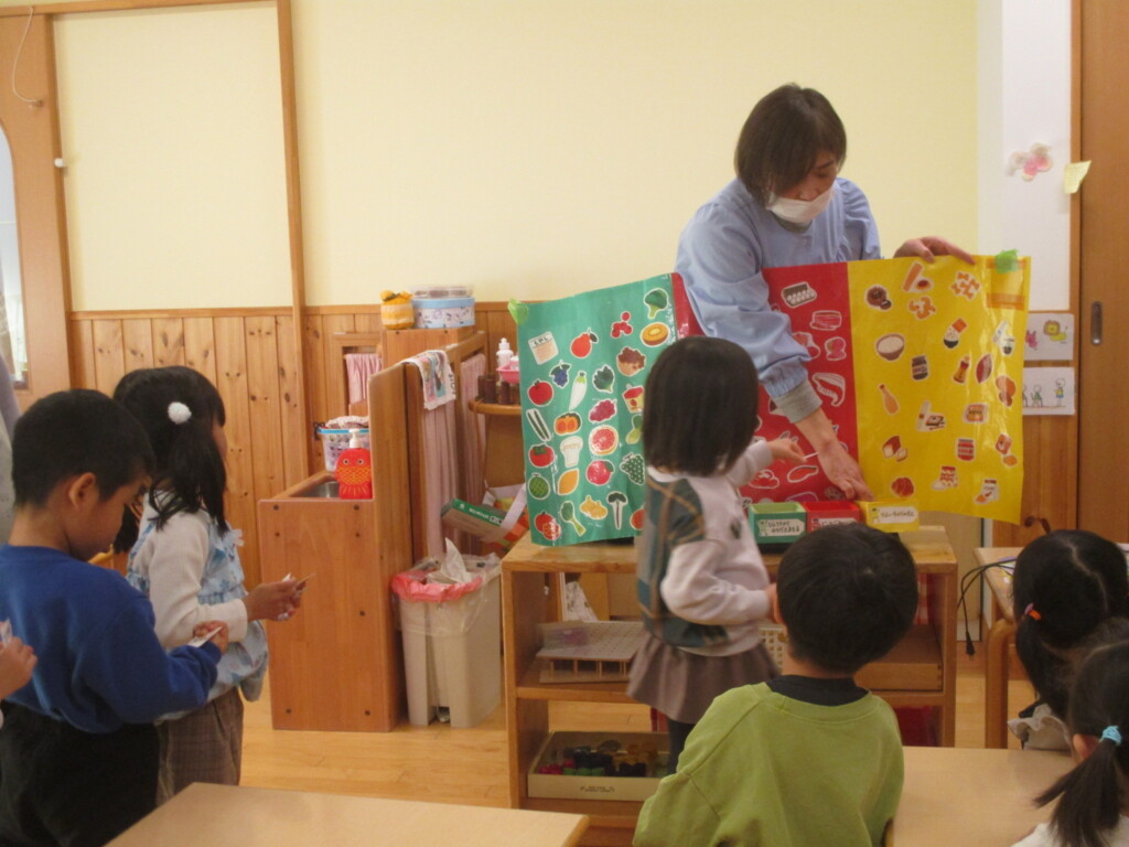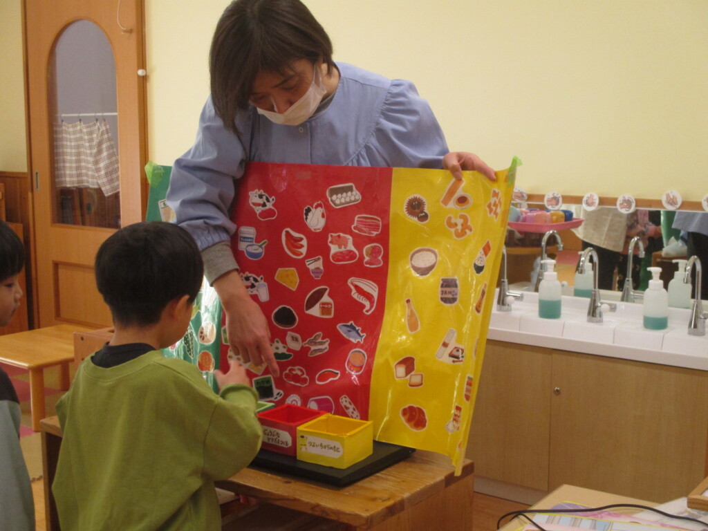 食品の栄養素は『エネルギーになるもと(黄)からだをつくるもと(赤)調子をととのえるもの(緑)』の三つに分けて考えられます。毎日食べている食べ物はどんな働きをするのかな?画像による説明のあとみんなも分類にチャレンジ!食品のカードをひいてどの色のグループになるか確認しながら入れていきます。『赤いリンゴは赤のグループじゃなくて緑グループなんだよ』ちょっと難しいですが毎日の給食の食材はどんな働きがあるのかな?そんなことをこれからも少しずつ学んでいきます😊