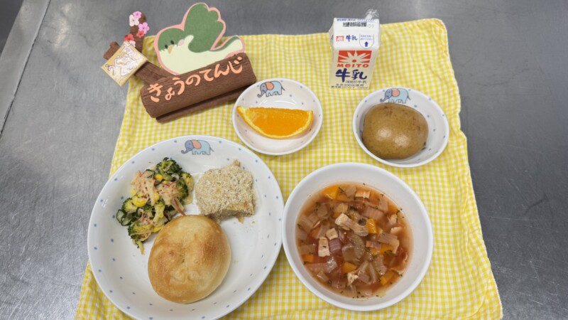 ◎給食 主食:ベーグル 汁物:ミネストローネ 主菜:スコップコロッケ 副菜:カニカマとブロッコリーのサラダ 果物:しらぬい