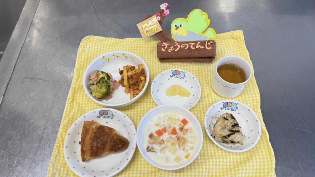 ◎給食 主食:クロワッサン 汁物:コーンチャウダー 主菜:ミートグラタン 副菜:ブロッコリーのサラダ 果物:はるか