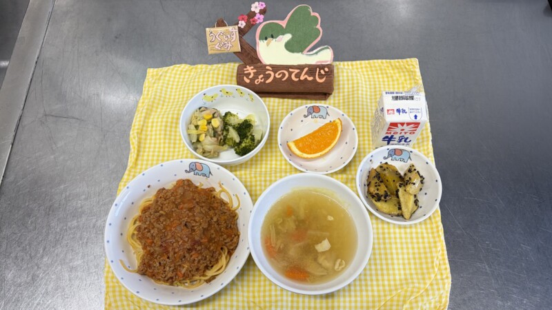 ◎給食 主食:スパゲティーミートソース 汁物:鶏肉と白菜のスープ 副菜:ブロッコリーソテー 副菜:ツナサラダ 果物:清見オレンジ