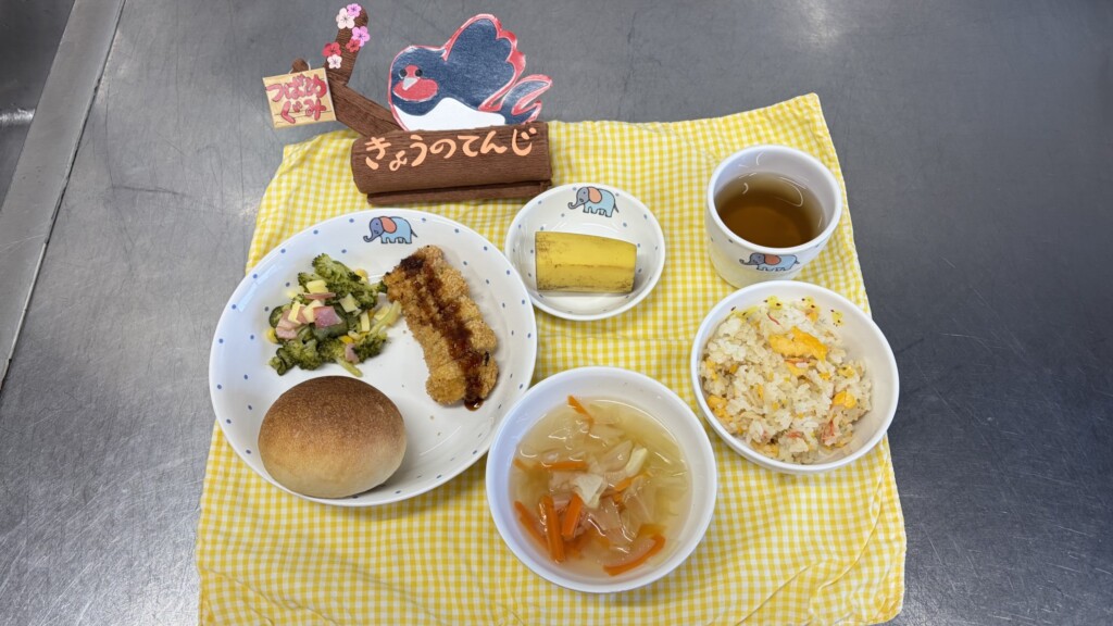 ◎給食 主食:牛乳パン 汁物:野菜スープ 主菜:ミルフィーユカツ 副菜:イタリアンサラダ 果物:バナナ