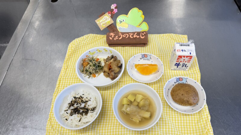 ◎給食 主食:ふりかけご飯 汁物:味噌汁(さつま芋・たまねぎ) 主菜:鶏肉と大根の煮物 副菜:小松菜とじゃこの和え物 果物:しらぬい