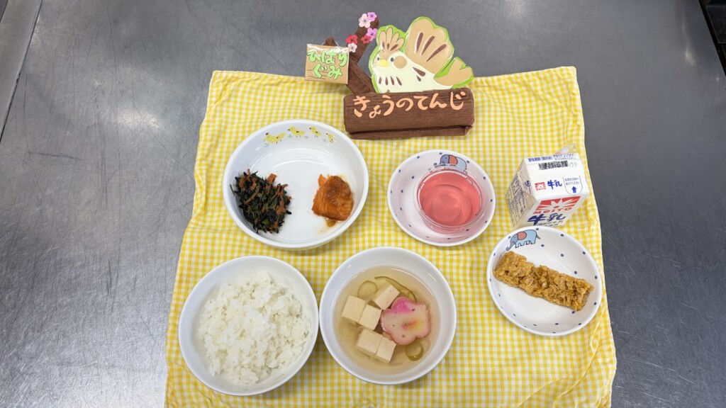 ◎給食 主食:ご飯 汁物:すまし汁(葱・花麩・豆腐) 主菜:鮭の味噌バター煮 副菜:ほうれん草のひじきサラダ デザート:ゼリー(いちご味)