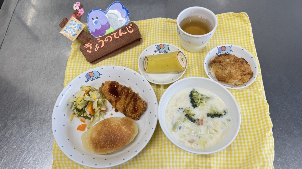 ◎給食 主食:ロールパン 汁物:白菜のミルクスープ 主菜:白身魚のフライ 副菜:フレンチサラダ 果物:バナナ