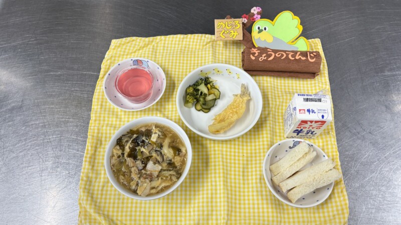 ◎給食 主食:かきたまうどん 主菜:きすの天ぷら 副菜:ブロッコリーとコーンのサラダ デザート:ゼリー(イチゴ味)