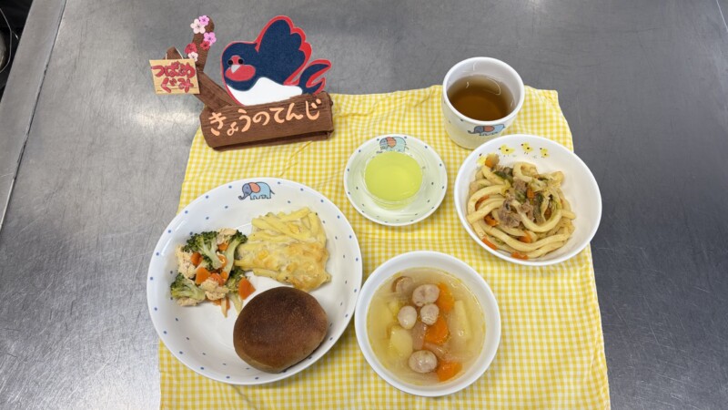 ◎給食 主食:キャロブパン 汁物:ポトフ 主菜:マカロニグラタン 副菜:チキンサラダ デザート:ゼリー(マスカット)